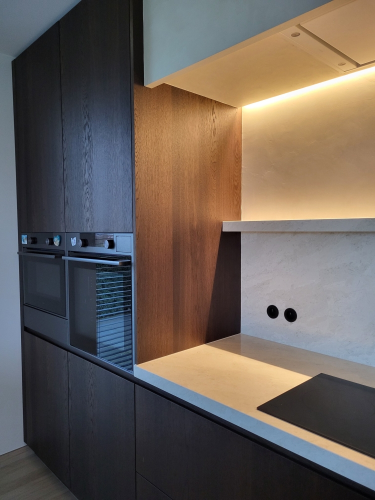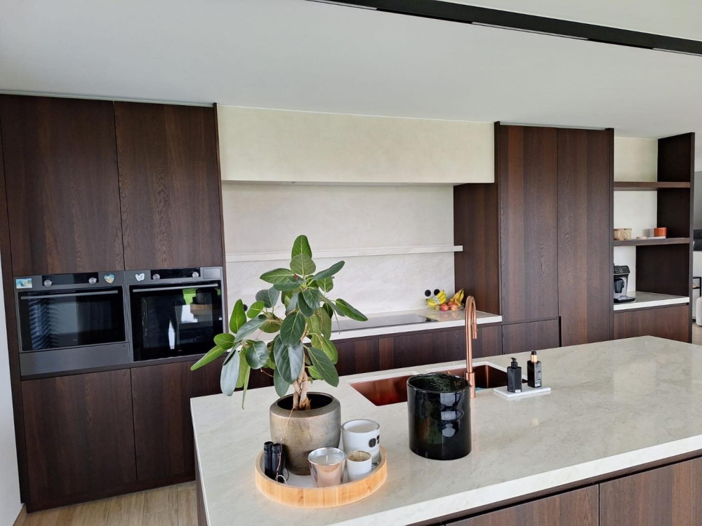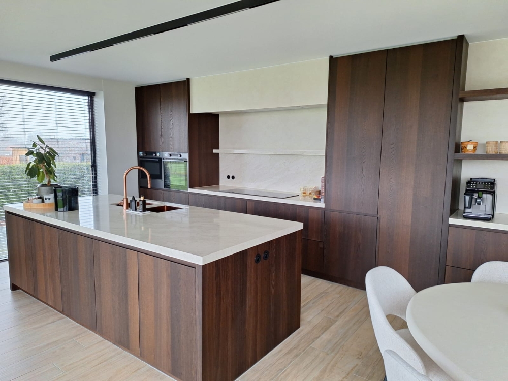 eze prachtige maatwerkkeuken is uitgevoerd in Smoked Oak fineer, wat zorgt voor een diepe, warme uitstraling met een natuurlijk karakter. Het exclusieve Taj Mahal kwartsiet werkblad voegt een elegante, zachte glans toe en vormt een harmonieus contrast met het donkere hout.